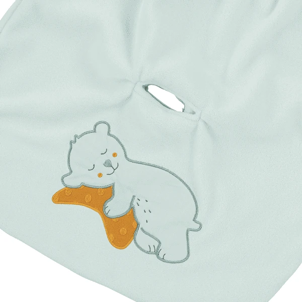 Prachtig stoeipartijnestje van microfleece met schattige appliquébeer “Ben” en praktische gordelsleuf, knuffelig verpakt, de reis kan beginnen!