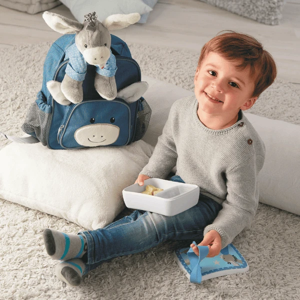 Mooie kinderrugzak met motief ezel Emmi. Praktisch voor de kleuterschool en de vrije tijd. Hoofdcompartiment met dubbele rits, zijzakken van gaas en geïntegreerd child naamplaatje. De buik- en schouderbanden zijn verstelbaar. Met reflectoren.