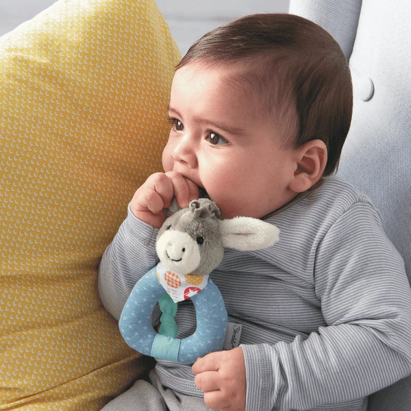 Greifling ezel Emmi van Sterntaler bestaat uit zachte fleece stof, jersey en poly cotton . Dit is het eerste speelgoed van de baby en het is erg goed om te grijpen en te horen. De grijpe ezel heeft ook een ingestoken rammelaar en zorgt zo voor nog meer plezier.
