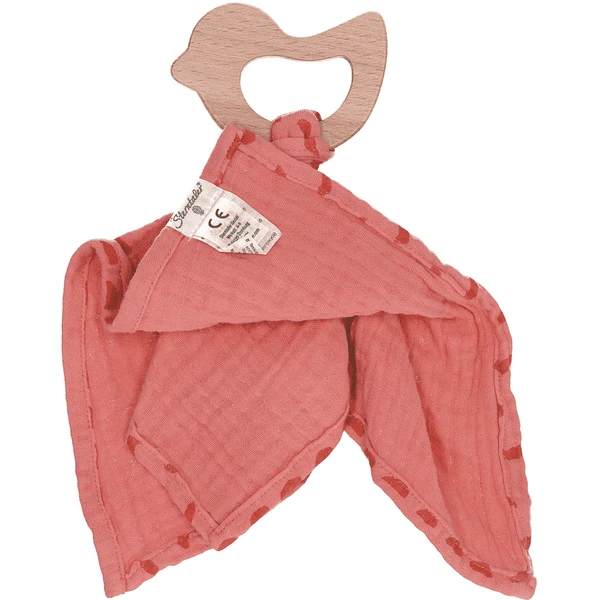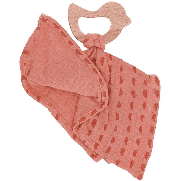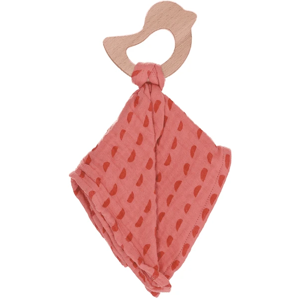 Klein knuffeldoekje van bedrukt mousseline (biologisch) met beukenhouten bijtring vogeltje, uit de serie Stay true to nature Enna en Otti.