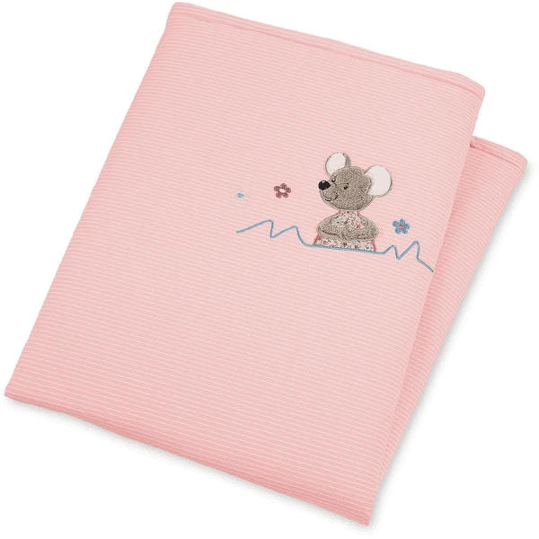 Knuffeldoekje, gewatteerd, gemaakt van jersey met leuke applicatie Mouse Mabel.
