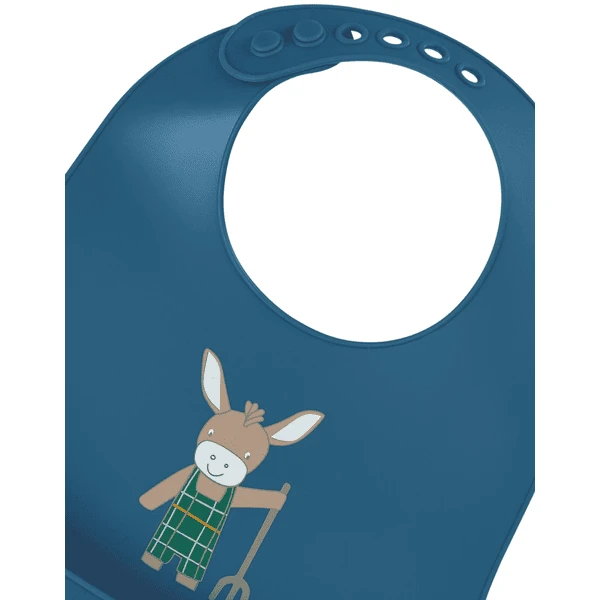 Met dit flexibele siliconen slabbetje met groot motief ezel “Emmilius” kun je gemakkelijk iets missen tijdens het voeden. Het slabbetje is vaatwasmachinebestendig, BPA-vrij en heeft een praktische morsbak. Op die manier worden de kleren en de vloer beschermd tegen voedselresten. Dankzij de verstelbare sluiting kan het slabbetje lange tijd worden gebruikt.