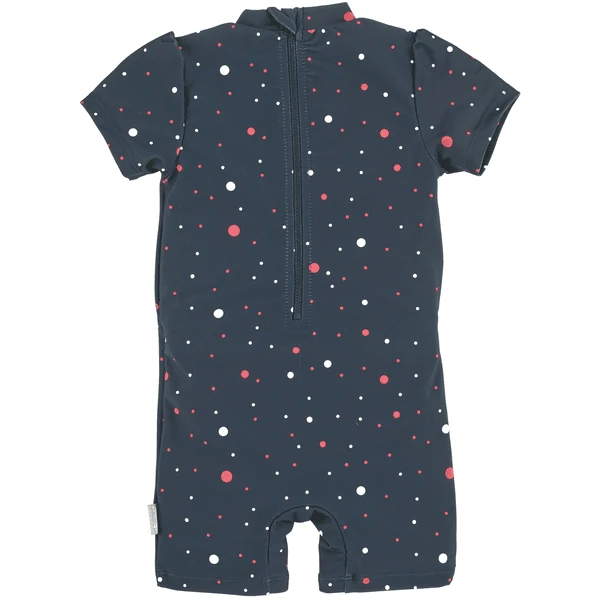 - Eendelig zwempak van badstof met spandex in een stippenpatroon.